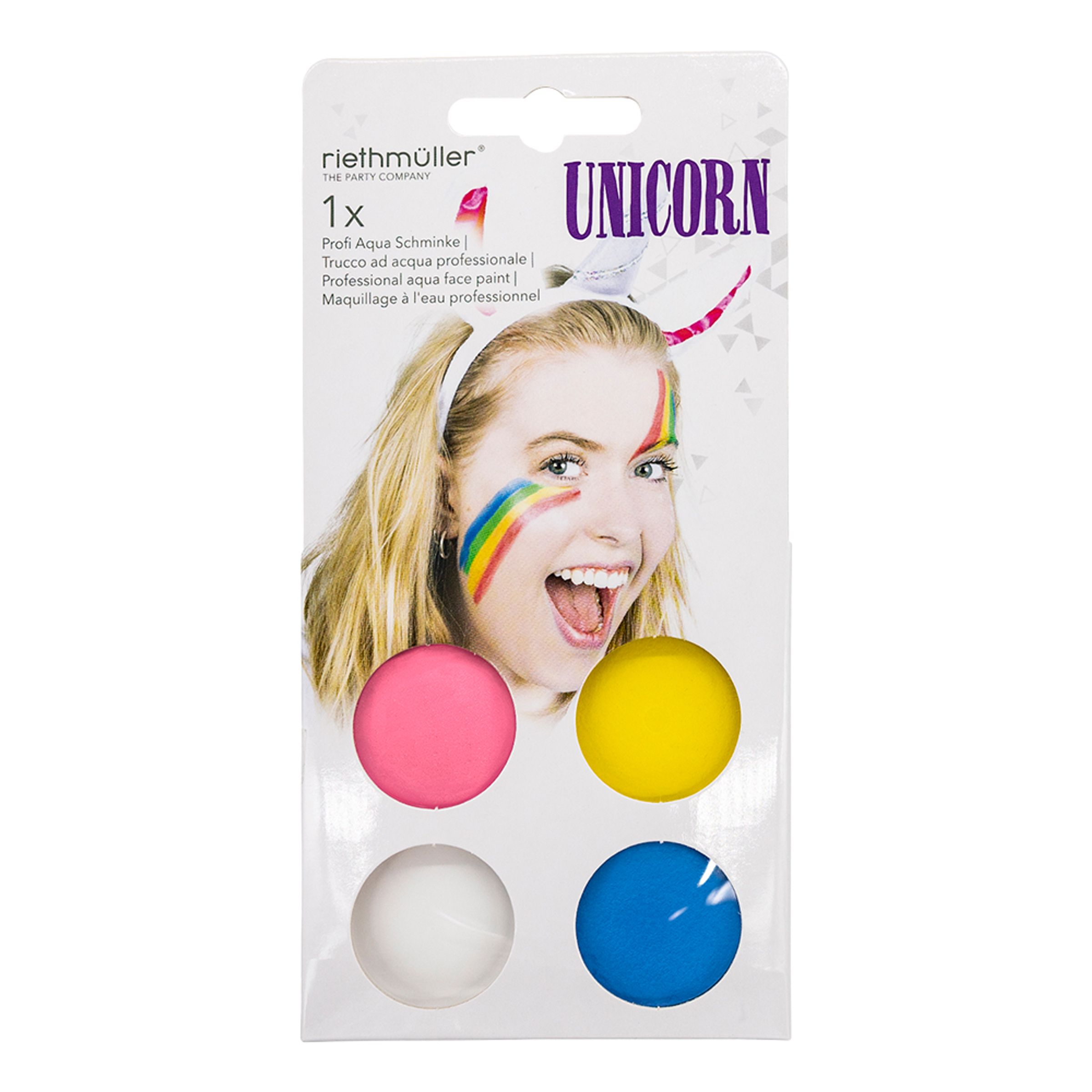 Sminkset Enhörning inkluderar en sminkpensel och fyra olika färger som passar utmärkt att använda för att göra en komplett enhörnings-sminkning. Perfekt till såväl maskeraden som till barnkalaset med unicorn-tema!