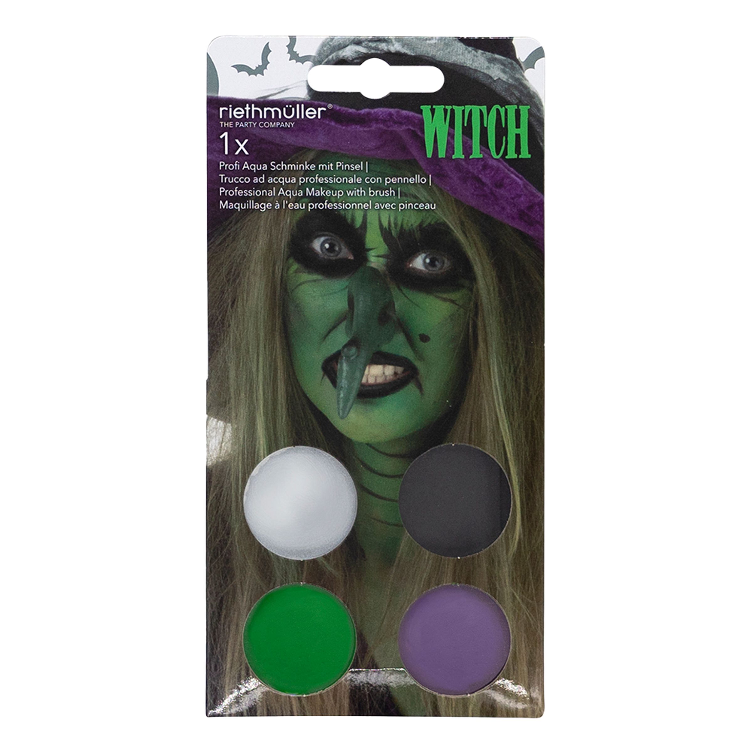 Sminkset Häxa inkluderar en sminkpensel och fyra olika färger som passar utmärkt att använda för att göra en komplett häxsminkning. Perfekt till halloween!