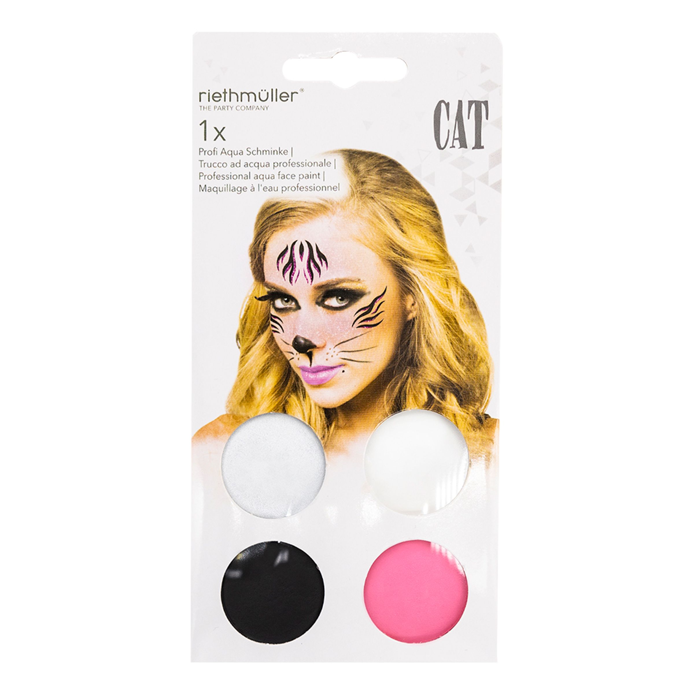 Sminkset Katt inkluderar en sminkpensel och fyra olika färger som passar utmärkt att använda för att göra en komplett kattsminkning. Perfekt till såväl maskeraden som till barnkalaset med djurtema!