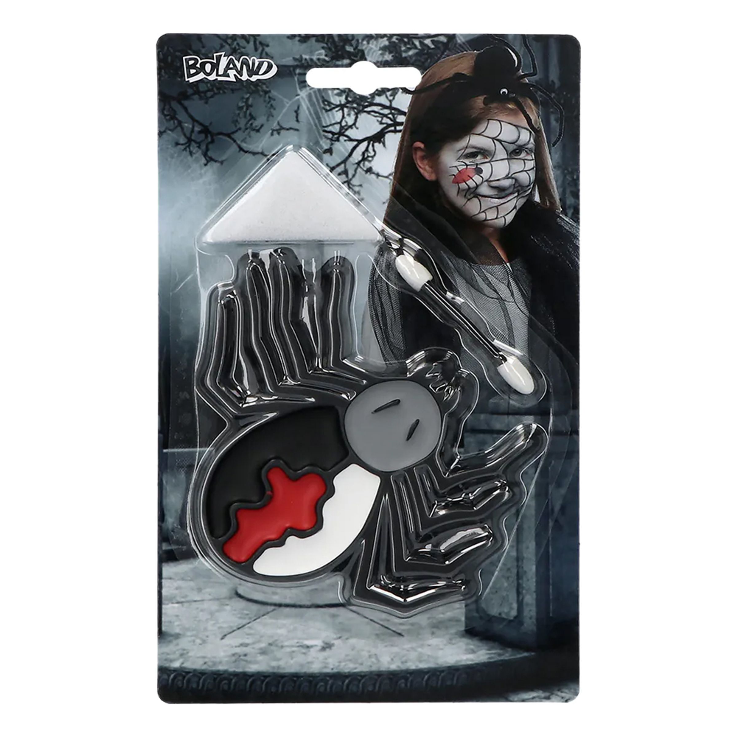 Har du blivit biten av en skum spindel? Dags att sminka sig därefter! Med det här kitet kan du göra häftiga ansiktsmålningar och coola kreationer med små enkla medel. Sminket tvättas bort med tvål och vatten. Var försiktig vid applicering kring ögonen.
