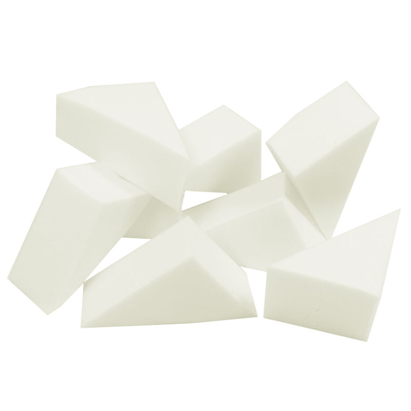 Sminksvampar Triangel omfattar triangelformade sminksvampar i vit design. Sminksvamparna bidrar till ett fint och symmetriskt lager av smink.