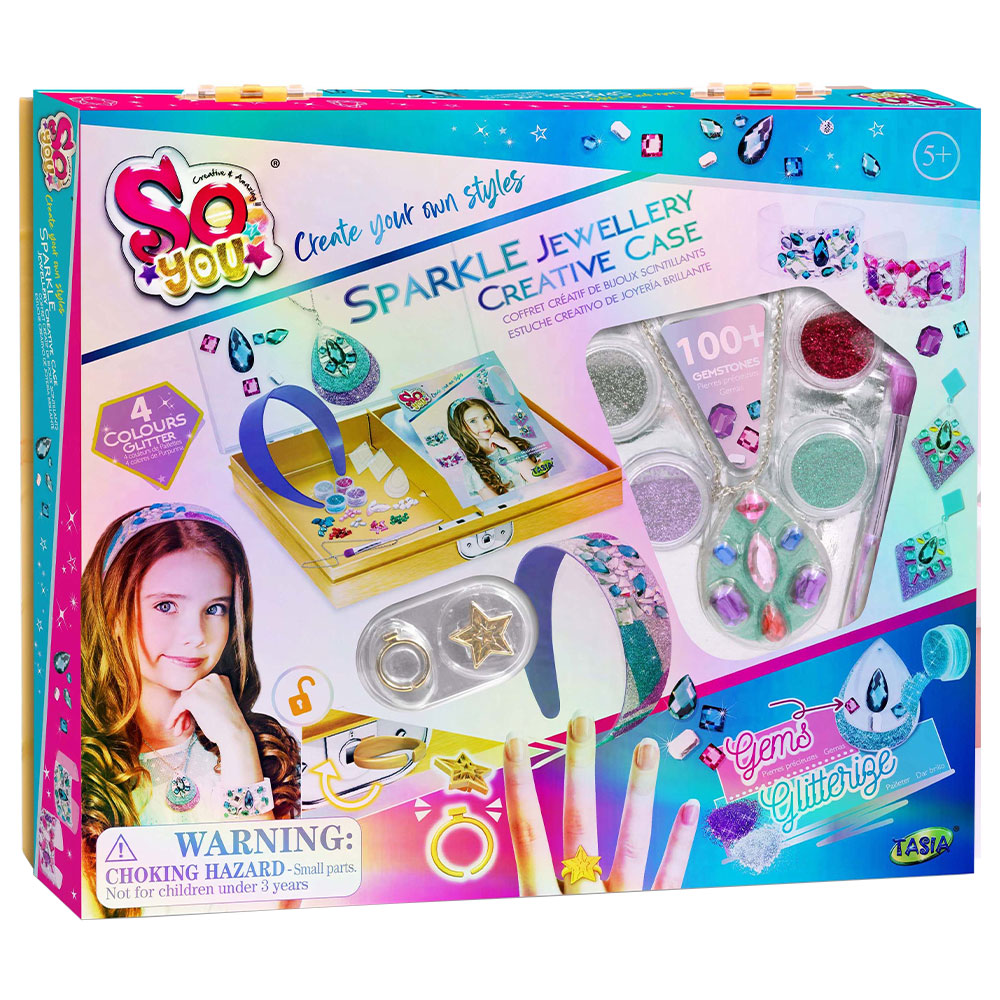 Smyckesset Armband och Diadem Låda med Lås omfattar en häftig låsbar förvaringslåda som man öppnar med hjälp av den medkommande ringen. Förvaringslådan innehåller allt du behöver för att skapa dina egna vackra armband och diadem. Innehåller exempelvis över 150 ädelstenar, fyra burkar med glitter, ett dubbelsidigt glittrigt klistermärkesark, ett halsband, diadem och två armband.