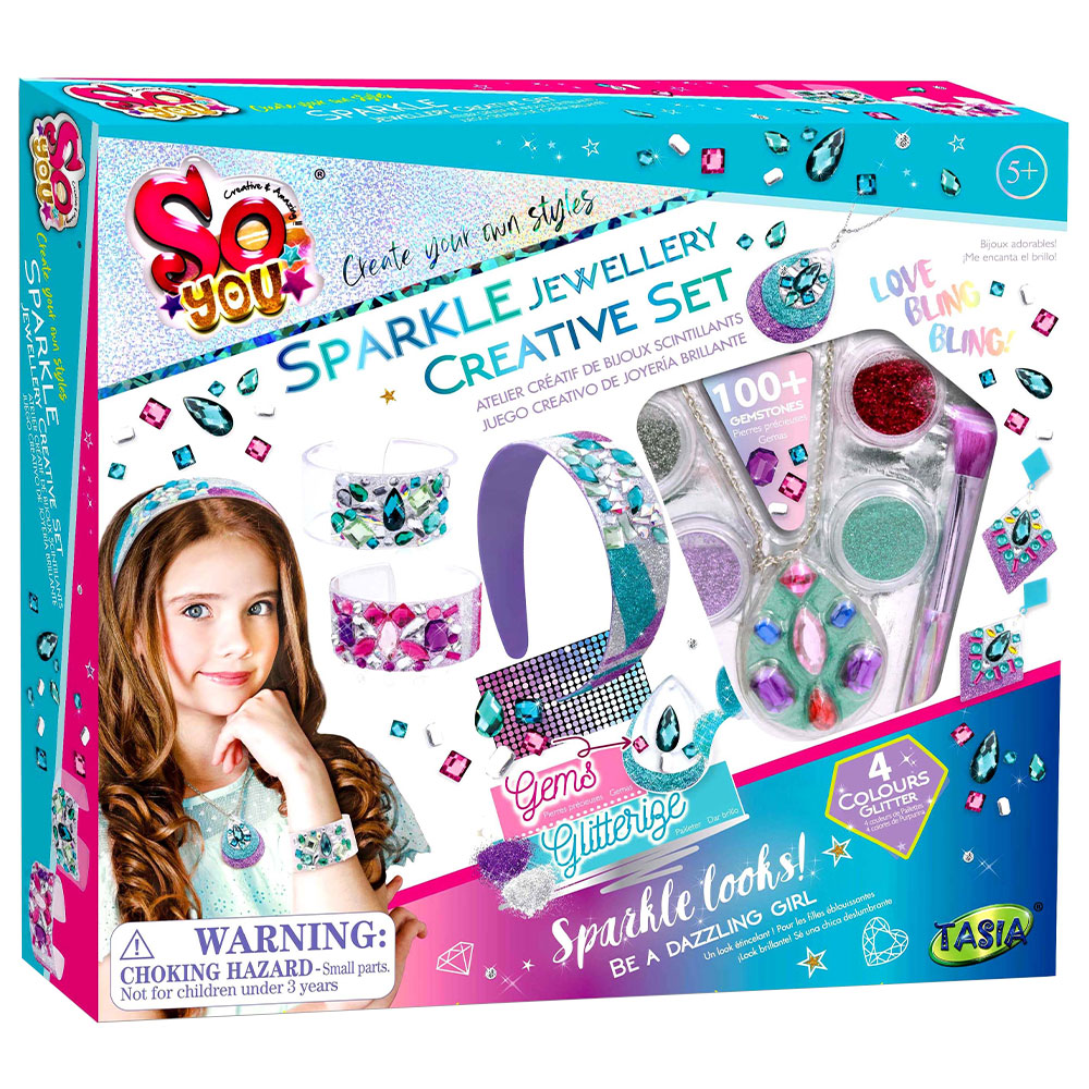Smyckesset Armband och Diadem omfattar en förpackning med ett smyckeset som innehåller allt du behöver för att skapa dina egna vackra armband och diadem. Innehåller exempelvis över 150 ädelstenar, fyra burkar med glitter, ett dubbelsidigt glittrig klistermärkesark, ett halsband, diadem och två armband.