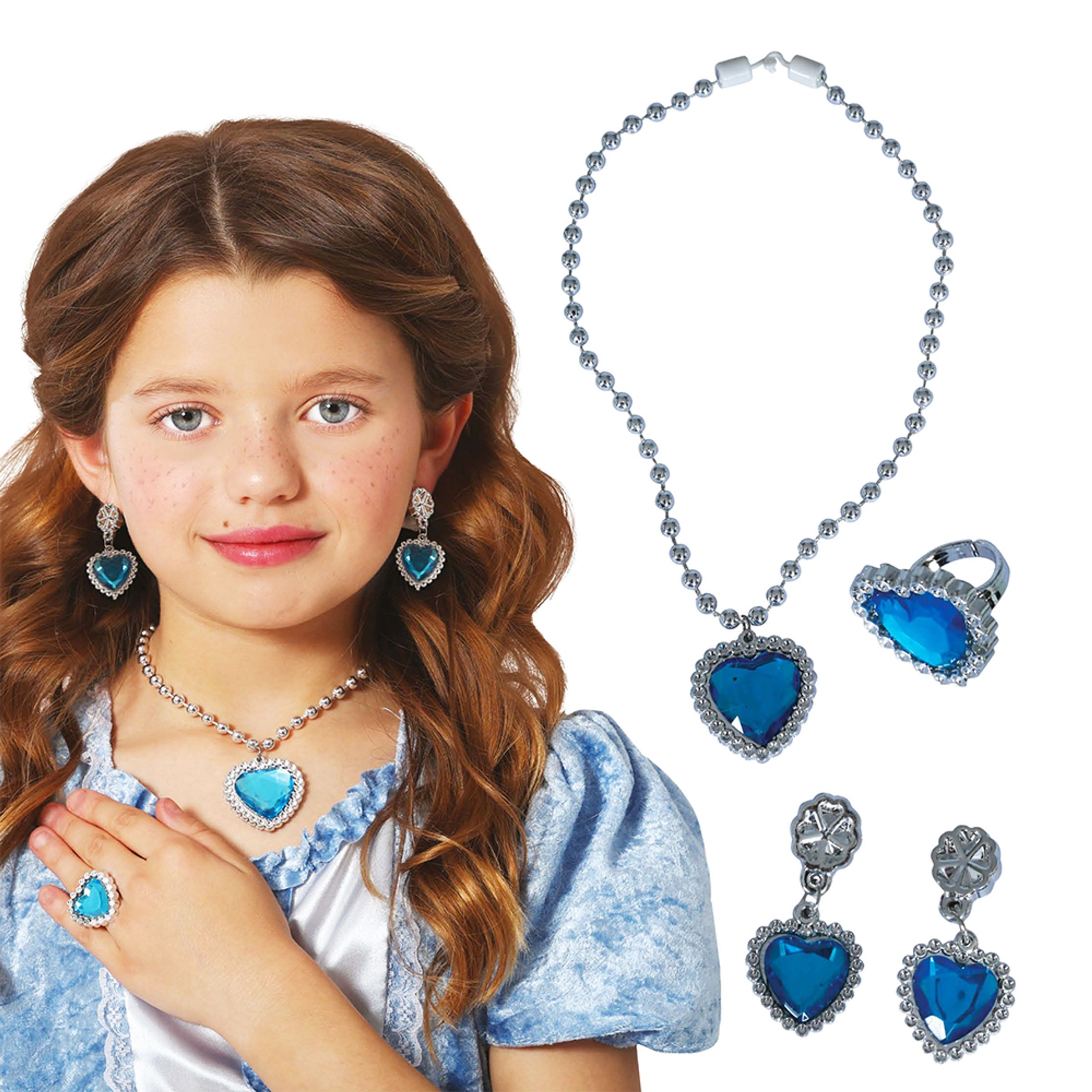 Smyckesset för Barn Blå inkluderar ett komplett tillbehörsset av accessoar-smycken för barnet som skall klä ut sig till en prinsessa. Kitet inkluderar en liten hjärtformad ring, ett matchande halsband och inte minst två låtsas-örängen som fäster på örsnibbarna med hjälp av klämmor.