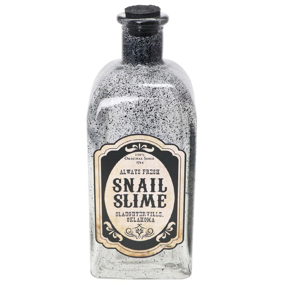 Snail Slime Glasflaska Dekoration omfattar en dekoration i form av en genomskinlig glasflaska med svarta prickar och en svart kork med etikett och texten "SNAIL SLIME" och andra detaljer.
