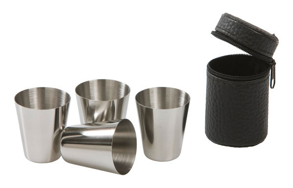 Snapskoppar med Fodral omfattar fyra stycken shotglas av rostfritt stål. Medföljer även ett svart läder-fodral att förvara glasen i.