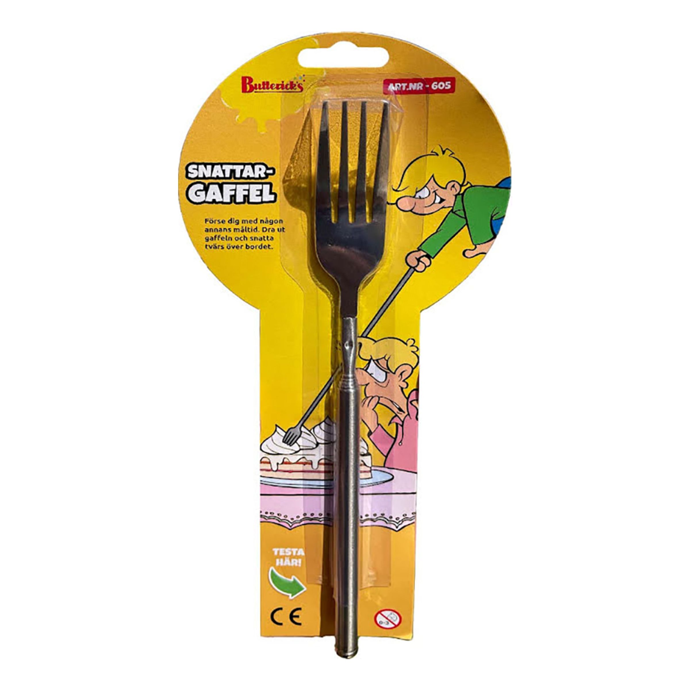 Snattargaffel Skämtartikel är en teleskopsgaffel som du lätt drar ut och snabbt kan knycka familjens mat med när de inte ser. En rolig skämtartikel att använda på julbordet eller ge bort i present till din mest humoristiska vän.