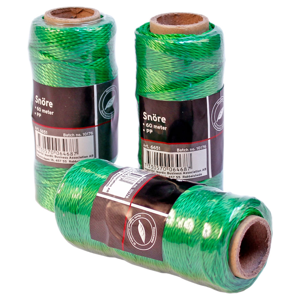 Snöre Grön består av ett tvinnat snöre i grön färg. Snöret mäter 60 meter långt och är tillverkat av polypropen.