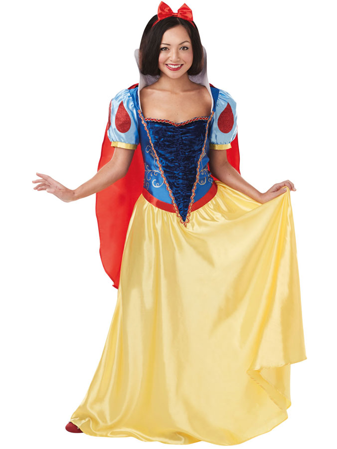 Snövit Dräkt är en maskeraddräkt för vuxna. Det ingår en gul-blå klänning med röda detaljer och vit krage. Det ingår även ett rött hårband med stor rosett och en röd mantel. Matcha med kort, svart peruk och lämpliga skor för en perfekt Snövit utklädnad.