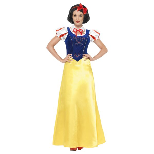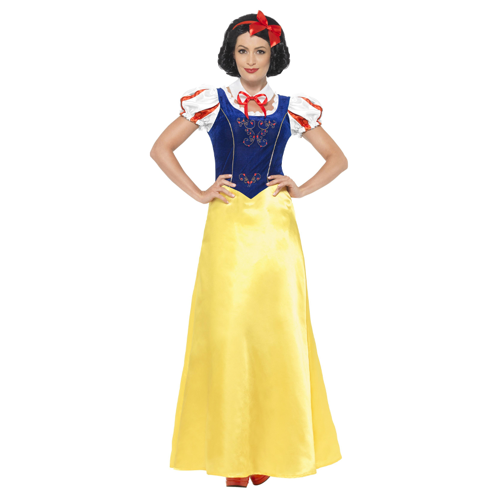 Snövit Maskeraddräkt omfattar klänning med puffärmar, krage och hårband med rosett i klassisk Snövit stil.