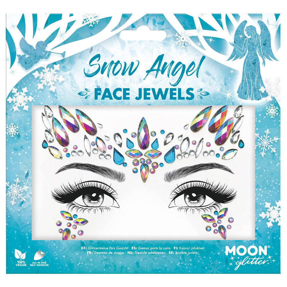Snow Angel Ansiktssmycken omfattar tre stycken ansiktssmycken med diamanter i olika nyanser av vitt, rosa, blått och grönt. Diamanterna sitter på genomskinliga stickers med självhäftande baksida. Applicera ansiktssmycket genom att försiktigt dra av hela stickern från plasten och tryck det mot ren och torr hud.