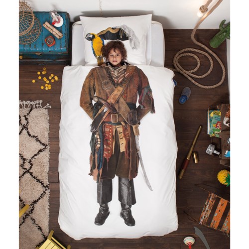 Se upp, här sover en riktig pirat! Detta häftiga bäddset för enkelsäng har ett fotorealistiskt tryck av en sjörövare med full mundering, ståtlig hatt och papegoja på axeln. Kul detalj i sovrummet!