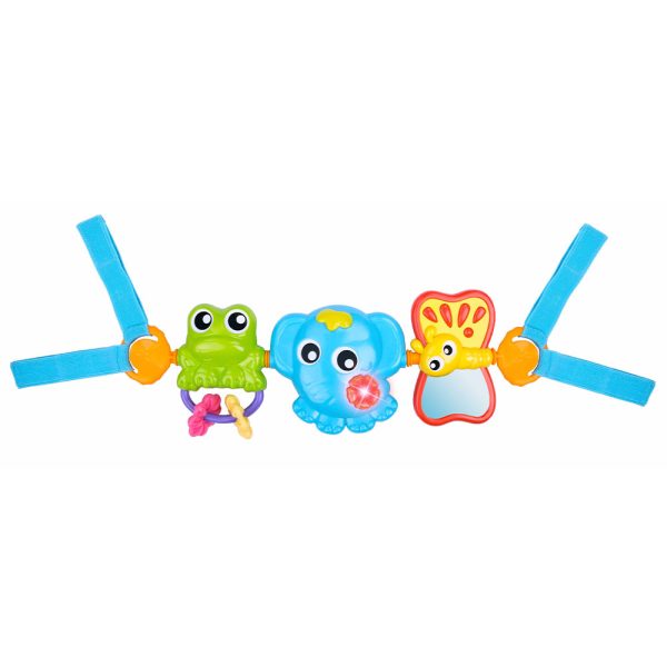 En bebis kan ha glädje av en aktivitetsleksak med olika djur, ljud och ljus som kan fästas på barnvagn eller placeras vid bilbarnstol för att skapa en stimulerande och underhållande upplevelse under resor eller promenader.