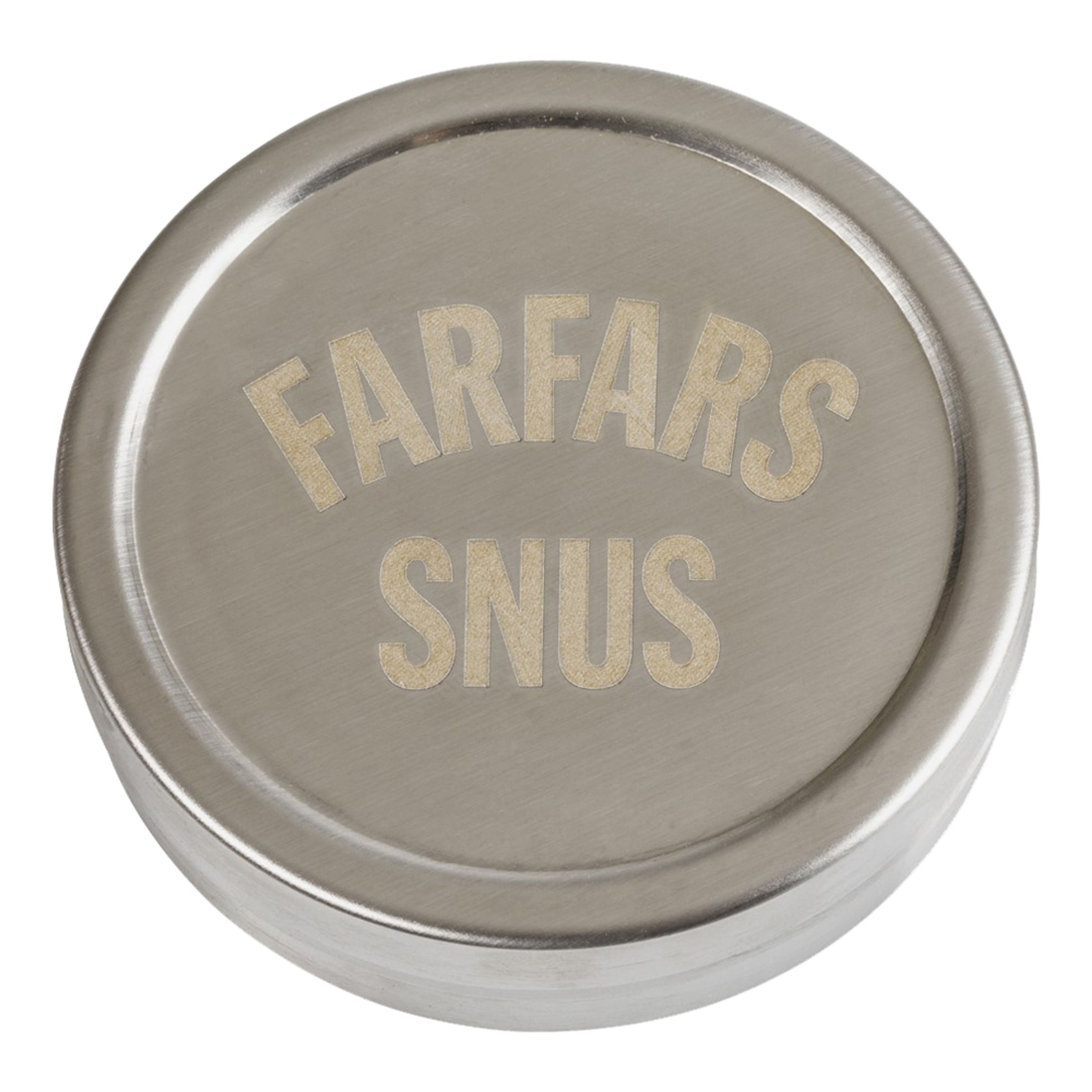 Snusdosa Farfars Snus är en rund dosa med avtagbart lock. På locket står det "Farfars snus". Dosan är tillverkad i rostfritt stål och är ca 9 cm i diameter.