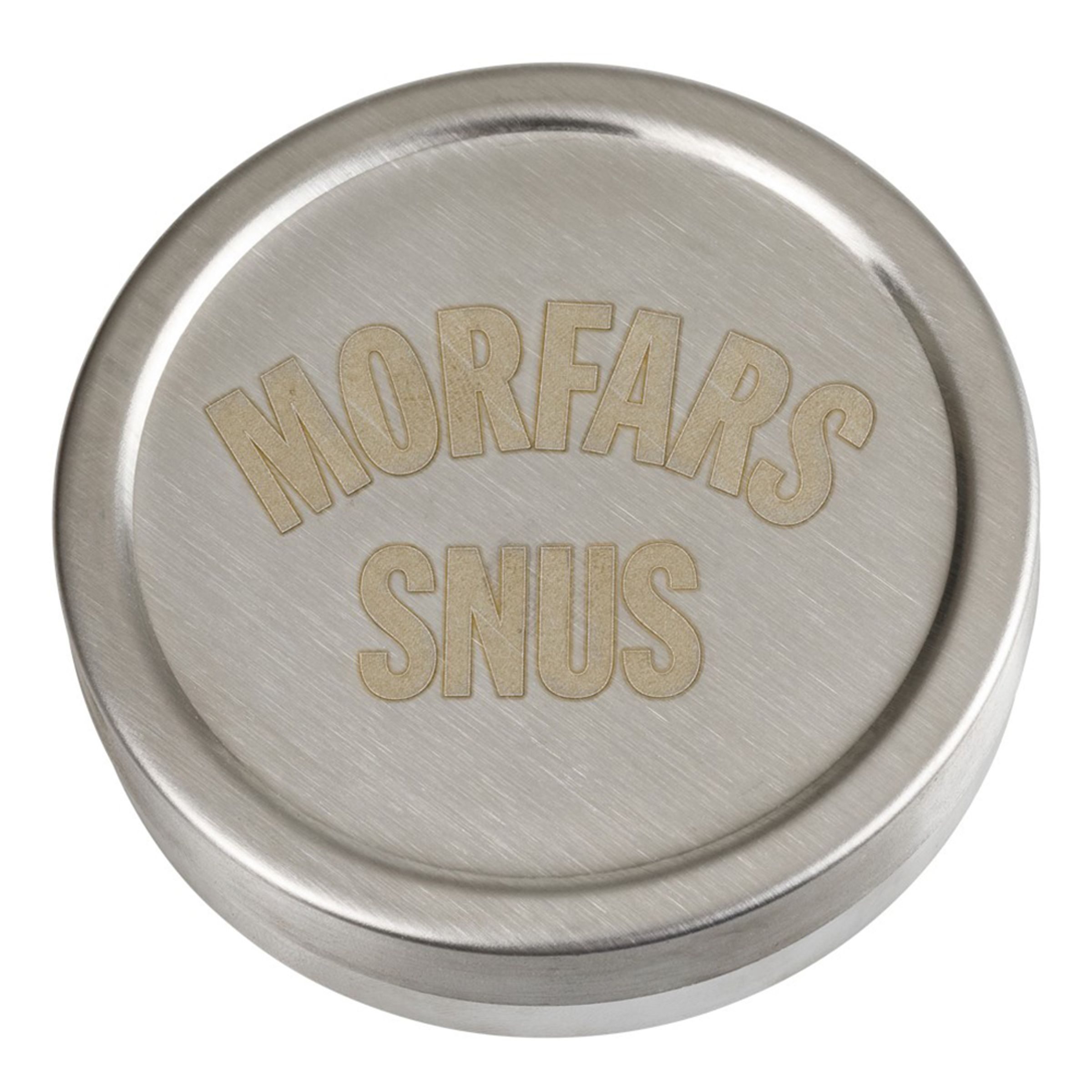 Snusdosa Morfars Snus är en rund dosa med avtagbart lock. På locket står det "Morfars snus". Dosan är tillverkad i rostfritt stål och är ca 9 cm i diameter.