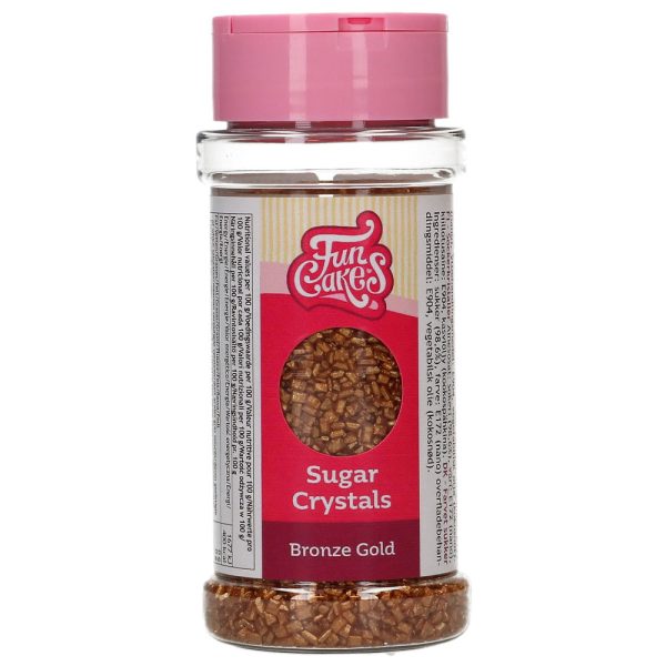 Sockerkristaller Bronsguld omfattar en burk med 80g bronsguldiga strössel som är formade som små sockerkristaller. Burken har även ett praktiskt strölock.