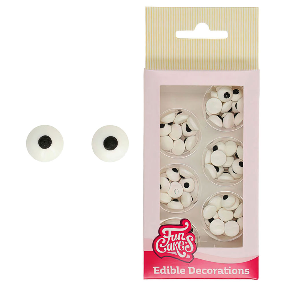 Med FunCakes sockerdekorationer i form av runda socker-ögon kan du dekorera dina bakverk som brownies, tårtor och cake pops. Dessa ätbara och glutenfria tårt-dekorationer är perfekta att göra både cupcakes med söta spöken och läskiga spindlar till kalas och halloween, men bli inte rädd när deras runda ögon tittar på dig innan du tar en tugga.