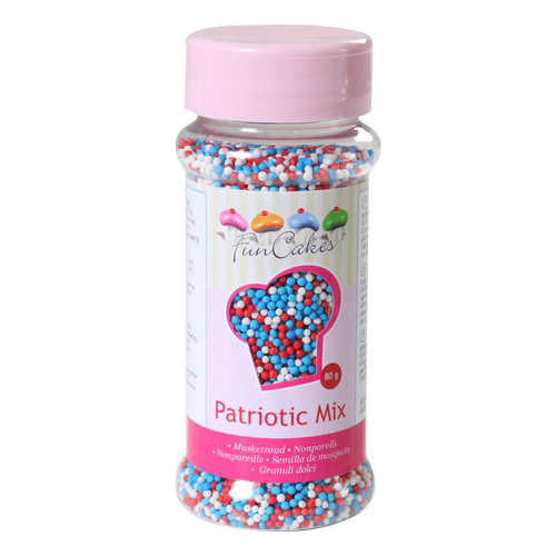 Sockerpärlor Röd/Vit/Blå består av ett strössel i form av röda, vita och blå pärlor. Burken innehåller 80 gram strössel.