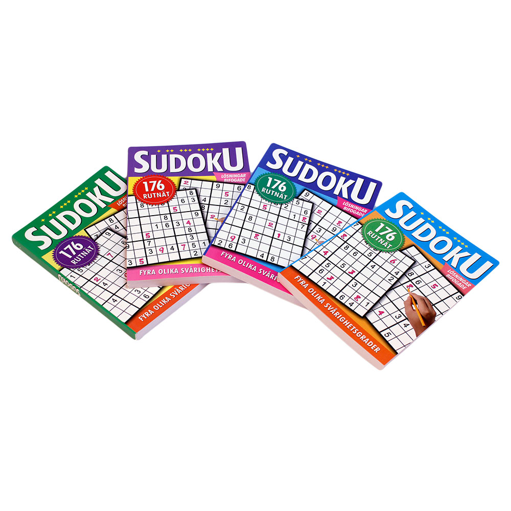 Sudoku Bok omfattar en sudokubok med 176 rutnät i fyra olika svårighetsgrader. Sudokuboken finns i flera versioner, vilken du får blir en överraskning.