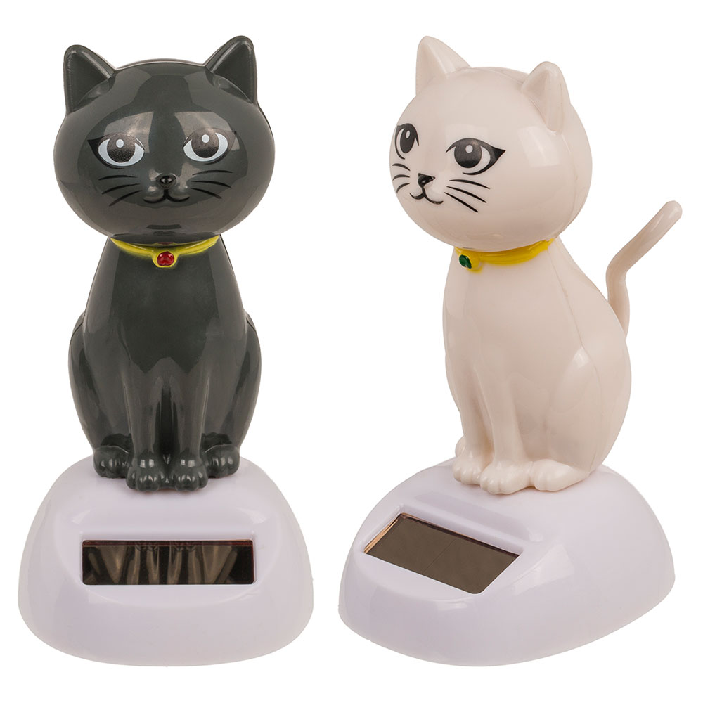 Solcellsfigur Nickande Katt omfattar en solcellsfigur som föreställer en katt av plast och finns i färgerna vit, svart och grå. Figuren laddas upp via solceller och börjar nicka huvudet fram och tillbaka.