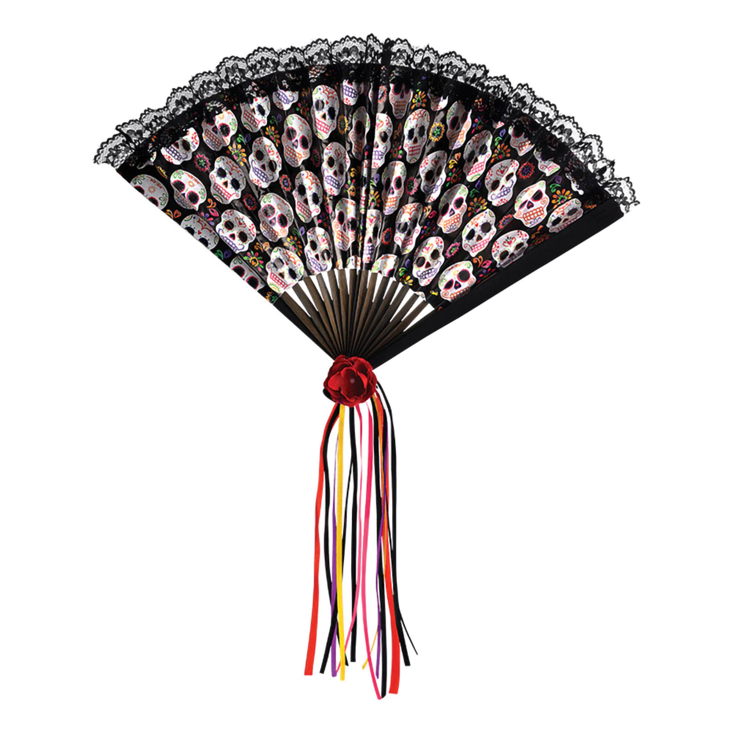 Denna solfjäder är en flott accessoar för dig som firar den mexikanska högtiden Day of The Dead. Det är en färgstark tillställning där du kan stöta på skelett i glada färger. Det är både kusligt och festligt på samma gång.