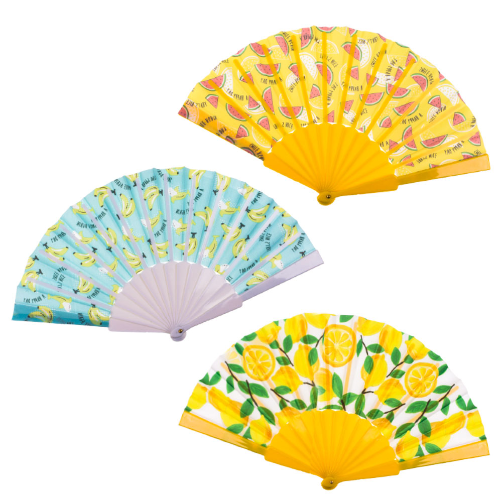 Solfjäder Fruity består av en solfjäder med motiv av frukter. Solfjädern finns i blått med bananmotiv, gult med melonmotiv och vitt med citronmotiv.