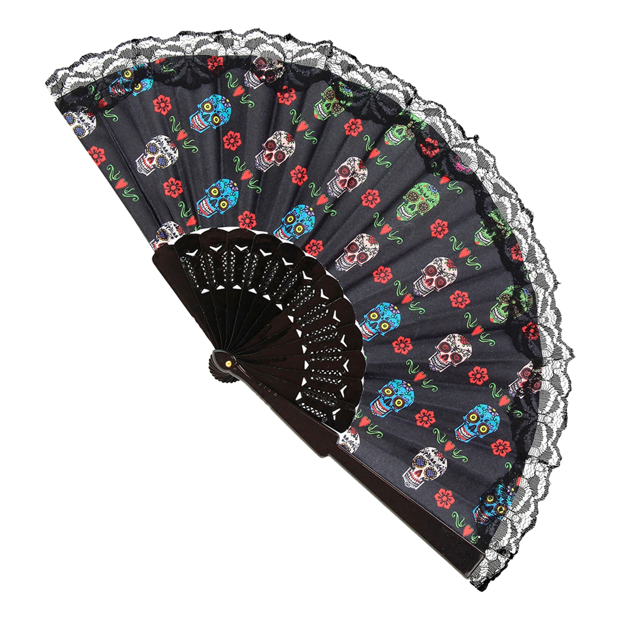 Solfjäder med Dödskallar är en tjusig solfjäder med motiv föreställande day of the dead-dödskallar. Fjädern fälls enkelt upp och ner och kan användas för att fläkta ansiktet.
