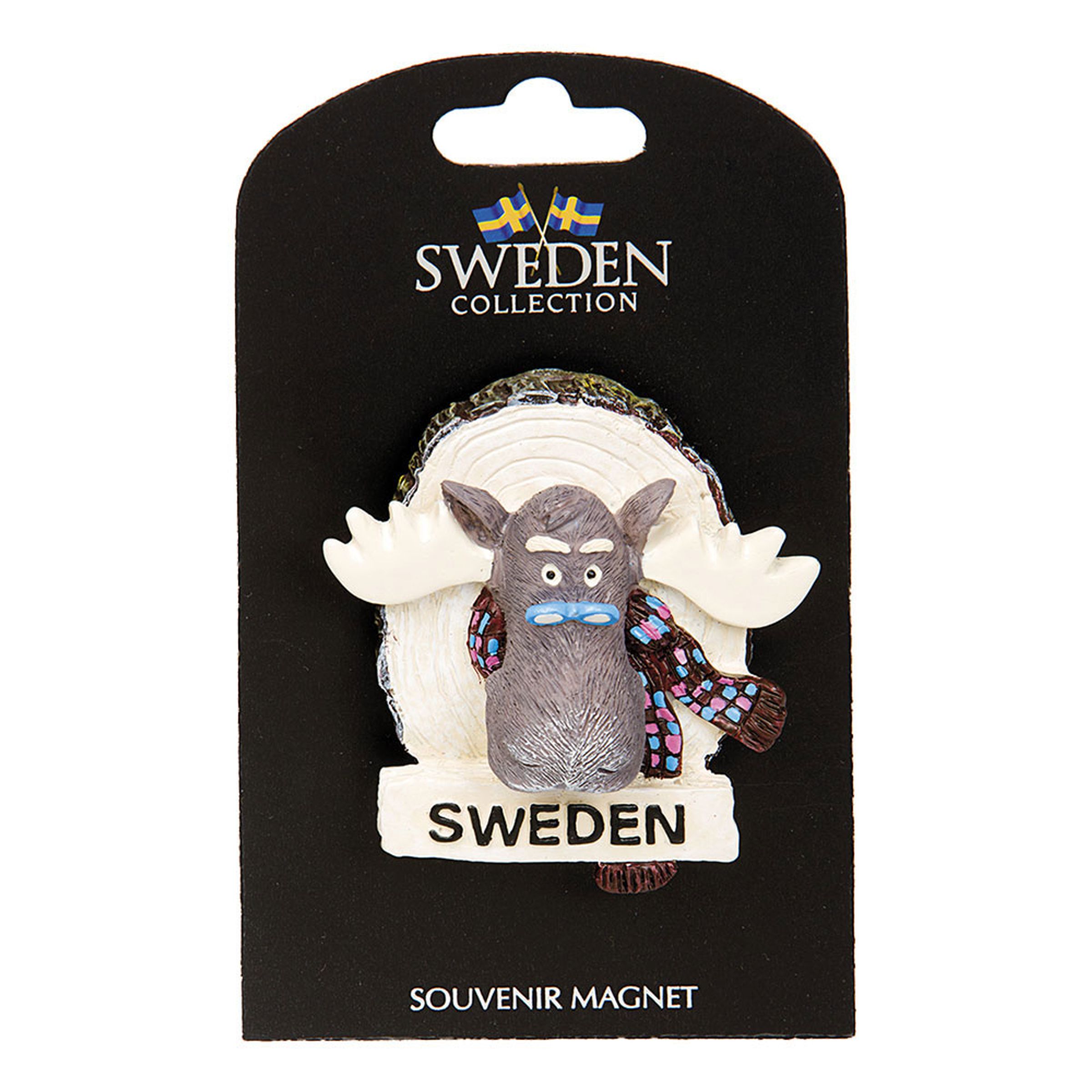 Souvenir Magnet Sweden Älg är en kylskåpsmagnet med ett älghuvud på en träbit. Älgen har glasögon och halsduk, för det brukar ju vara kallt i Sverige. Nedanför finns texten "Sweden".
