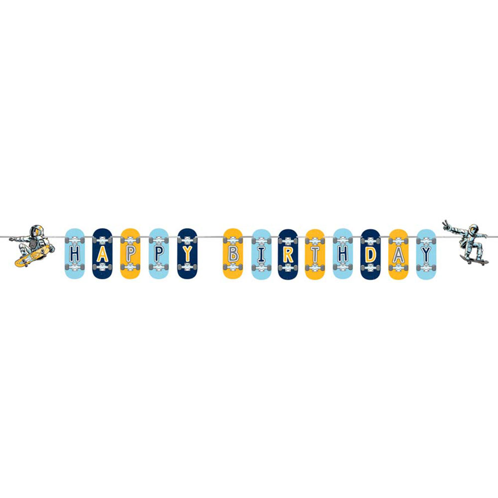 Drömmer du om att skejta i yttre rymden? Nu kan drömmen bli verklighet! Bjud in till ett häftigt skateboard kalas i yttre rymden och dekorera snyggt med denna matchande girlang. Snygg happy birthday girlang som enkelt ser till att alla kan se ditt kalastema. Ett skateboard- och rymdtema till nästa kalas blir med andra ord enkelt att få till med denna häftiga födelsedagsgirlang!