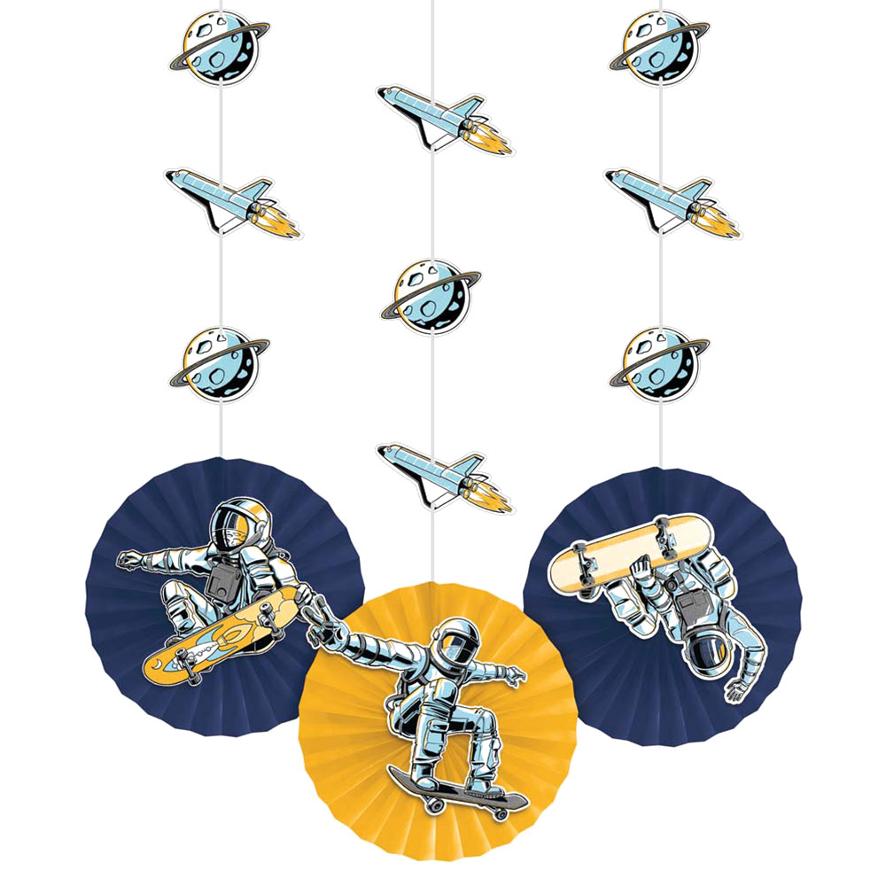 Space Skater Hängande Dekoration omfattar tre hängande dekorationer med motiv av planeter och rymdraketer i papp samt en utvikbar blå eller gul pappersrosett med motiv av en astronaut på skateboard. Dekorationerna är ca 91,4 cm långa och 20,3 cm breda.