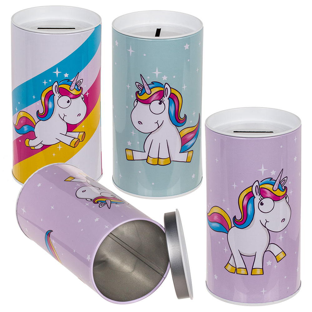 Sparbössa i Metall Enhörning är en spargris i metall med ett färgglatt och fantasifullt enhörningsmotiv. Det finns fyra olika versioner i lila, turkos och vit.