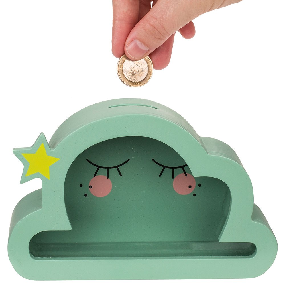 Sparbössa i Trä Sömnigt Moln omfattar en grönmålad spargris i form av ett sömnigt moln med stängda ögon och rosiga kinder samt en framsida i genomskinlig plast.