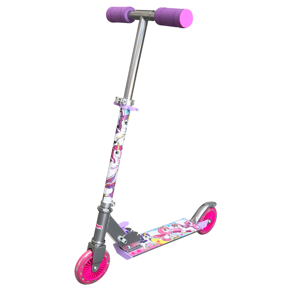 Stans häftigaste sparkcykel med enhörningar och lysande hjul, perfekt för alla barn från 5 år som vill susa fram på en riktigt cool kickbike, en scooter som garanterat kommer synas i vimlet av andra kickbikes. Denna sparkcykel med ljus och fina enhörningar passar utmärkt för alla unicorn lovers.