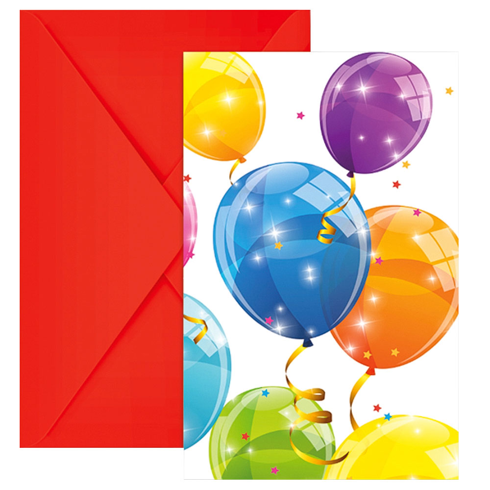 Sparkling Balloons Inbjudningskort omfattar ett 6-pack vikta inbjudningskort i vitt med motiv av färgglada ballonger. Korten har vit insida med texten "Party!" och streckade linjer och symboler i rött att skriva datum, tid, plats och telefon. Korten kommer med tillhörande kuvert i rött.