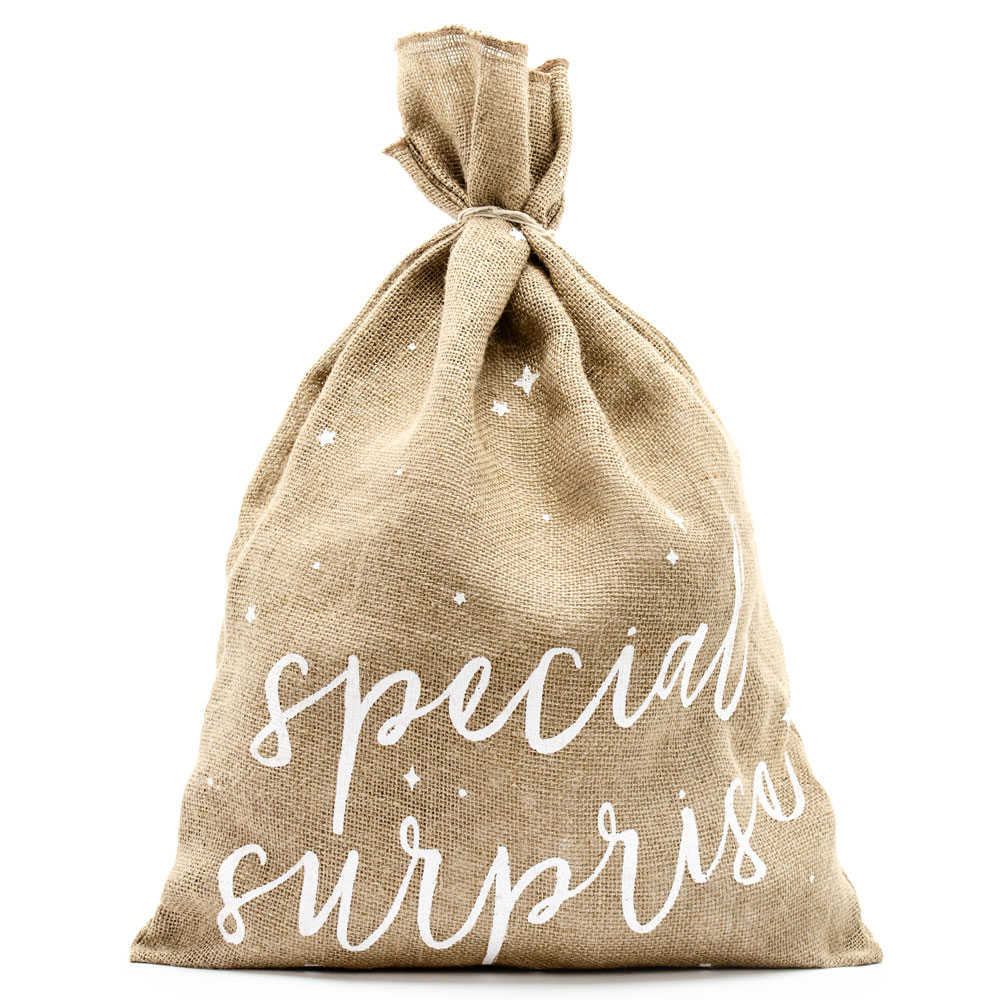 Special Surprise Jutesäck innehåller en brun jutesäck med texten "Special Surprise" och stjärnor i vitt. Säcken har även ett vitt band som man kan stänga den med.