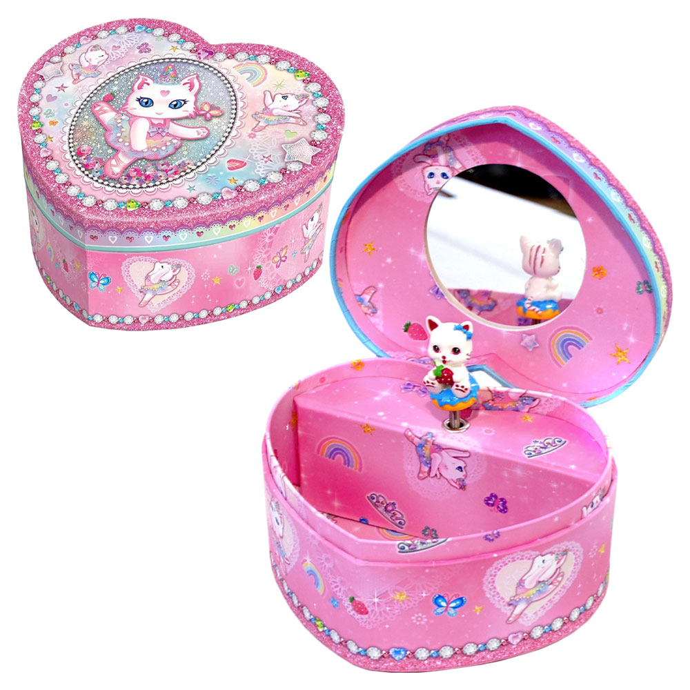 Spelande Smyckeskrin Ballerinakatt omfattar ett rosa, hjärtformat smyckeskrin med gulligt motiv av en ballerinakatt. Smyckeskrinet har en liten spegel, en snurrande katt och speldosa som aktiveras när locket öppnas. Skrinet är tillverkat av papp och är ca 7,7 cm högt, 15 cm långt samt 12 cm brett.