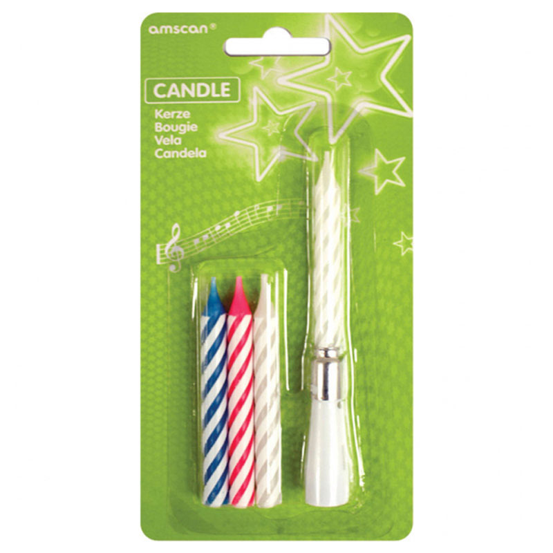 Spelande Tårtljus innehåller 4 stycken ljus i vitt blått och rosa samt en ljushållare som spelar musik. På förpackningens baksida finns instruktioner för att få musiken att spela.