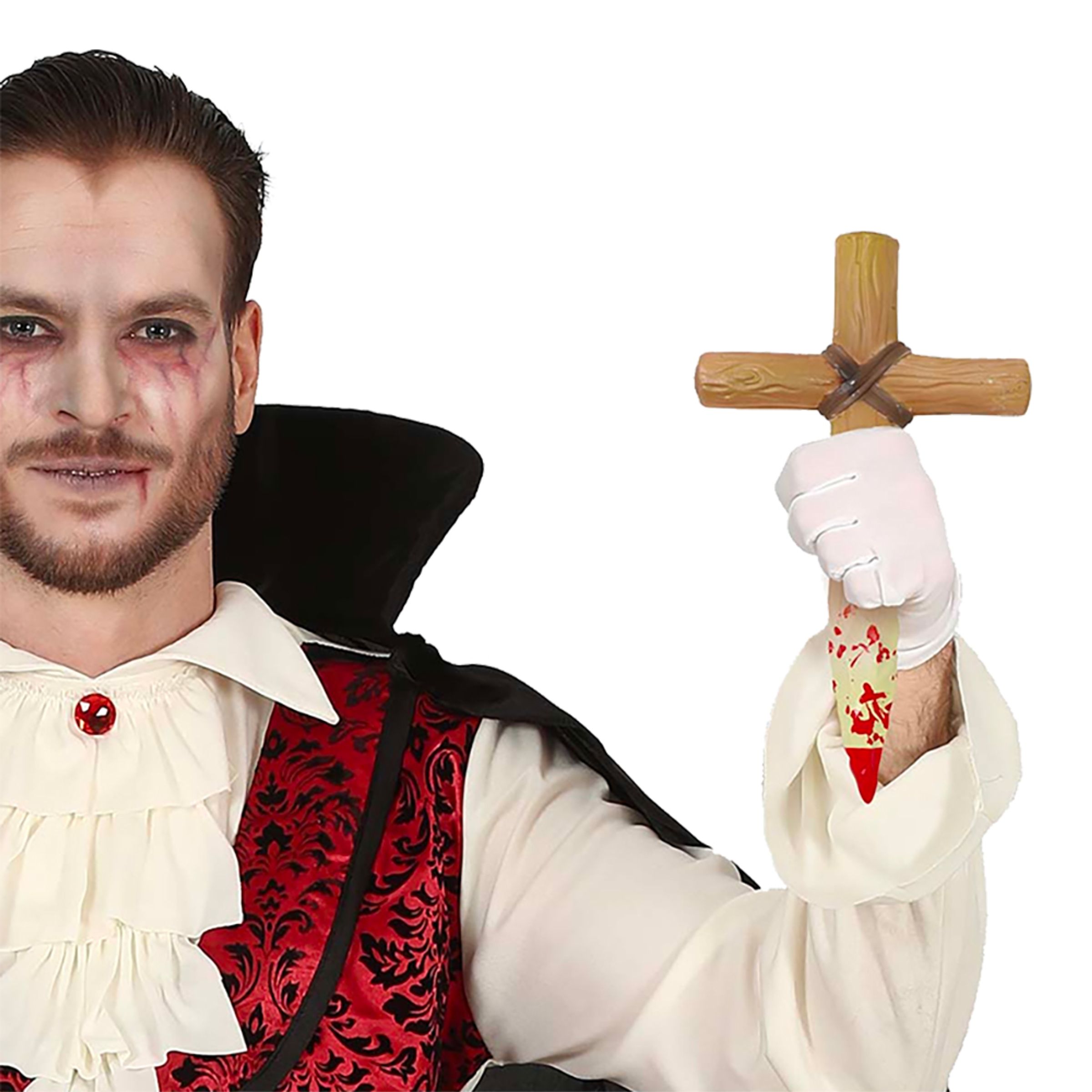 Spetsigt Kors med Blod är tillverkad av plast och kommer med blod nedtill. Korset är utformat för att se ut som ett kors av trämaterial. Ett klockrent tillbehör till halloweenfesten för att försvara dig mot eventuella vampyrer, för det sägs att en träpåle genom hjärtat är det enda sättet att tå kål på en vampyr.