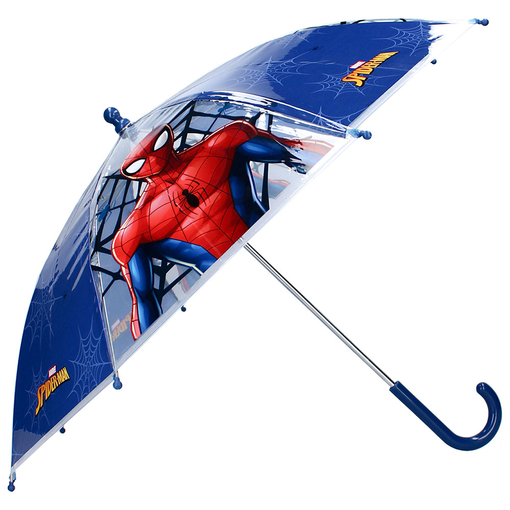 Spiderman Paraply Barn Rainy Days omfattar ett navyblått och transparent barnparaply tillverkat av plast med ett motiv av Spiderman samt texten "Marvel Spiderman".