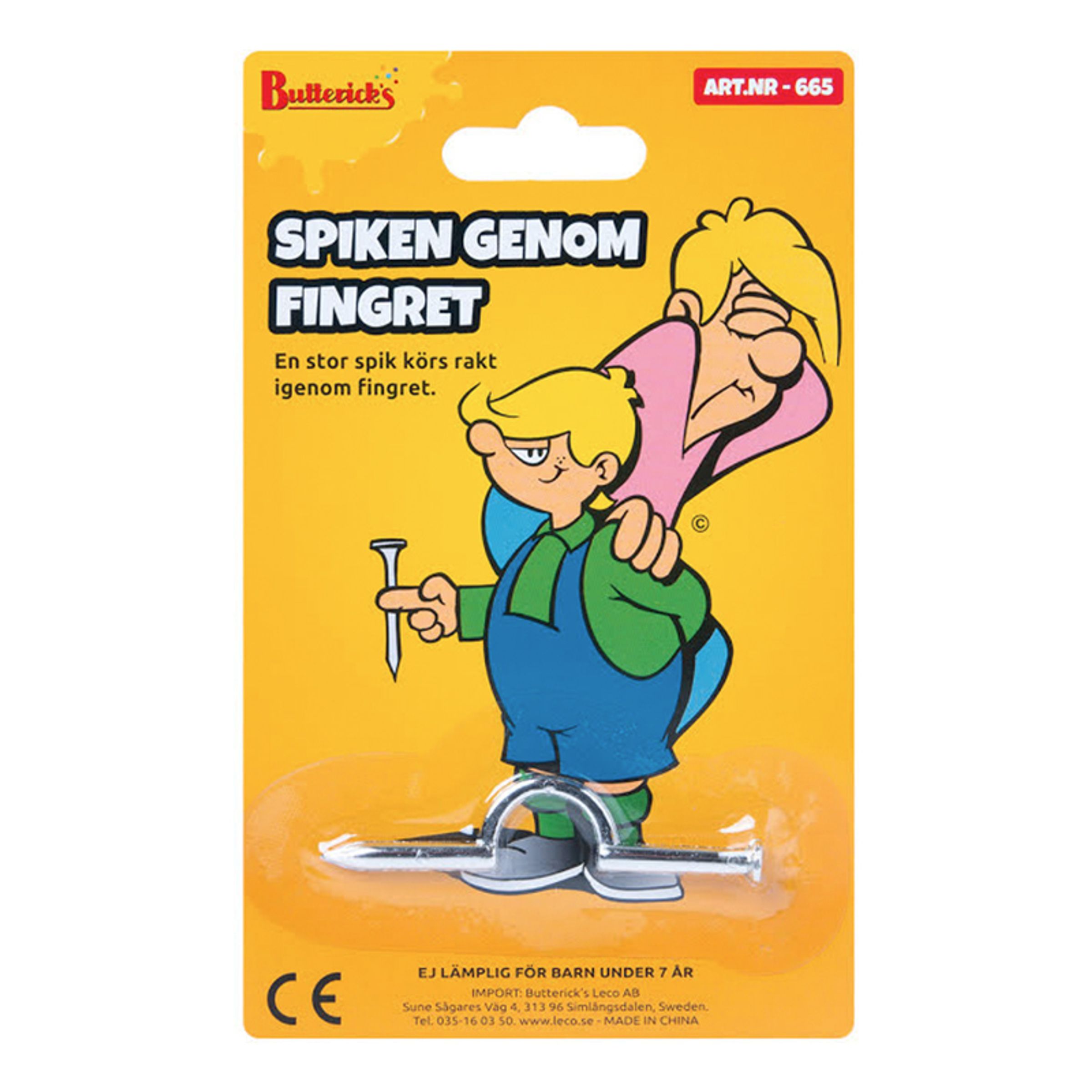 Spiken Genom Fingret Skämtartikel är en klassisk skämtartikel. Spiken är inte rak utan böjd i mitten så att du kan sätta den runt ditt finger. Illusionen blir att det ser ut som om spiken går rakt genom ditt finger. Skämtartikeln är inte lämplig för barn under sju år.