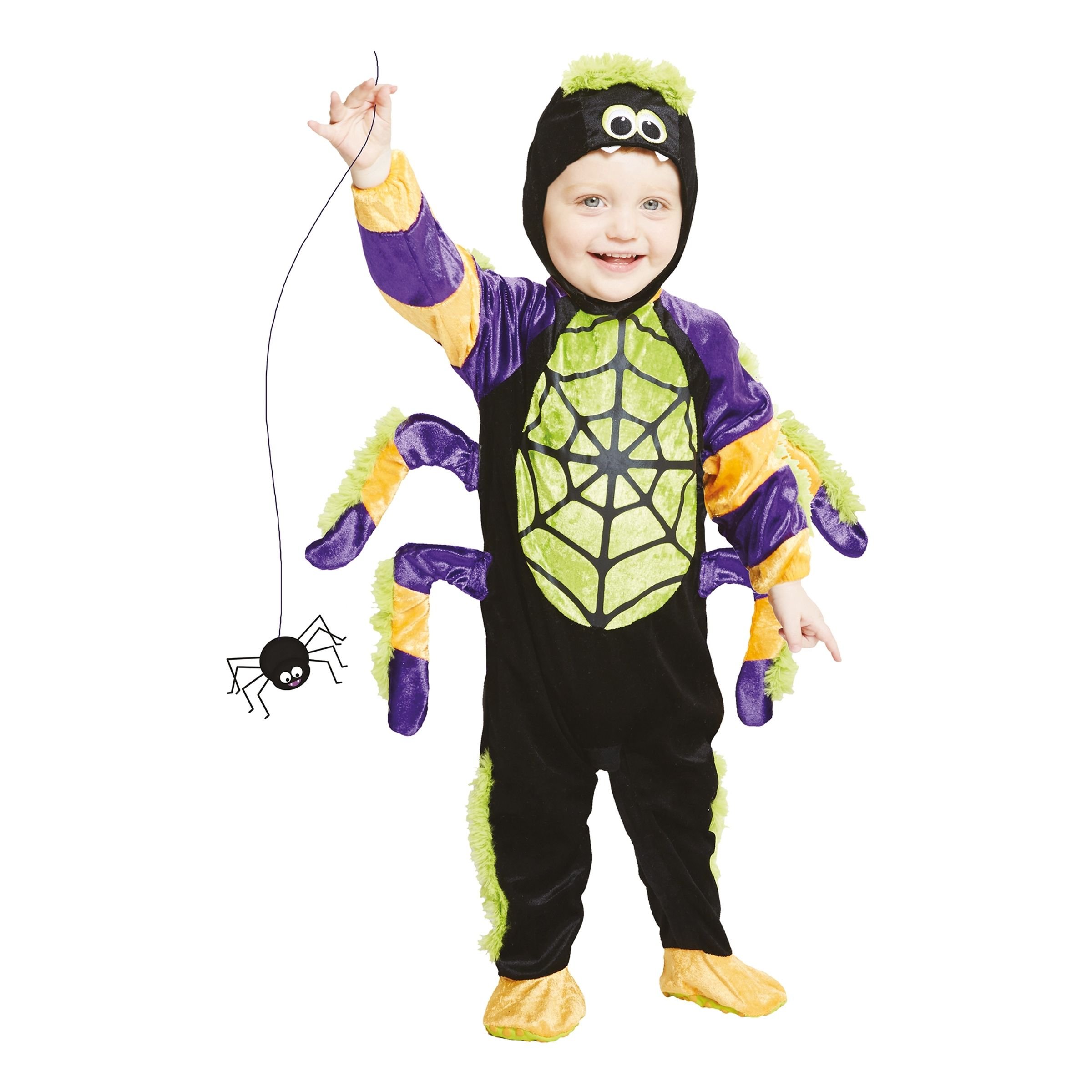 Spindel Bebis Maskeraddräkt inkluderar en svart, lila och orange jumpsuit med grönt spindelnätsmotiv på magen och orangea tossar med halkskydd under. På jumpsuiten finns fyra mjuka spindelben längs sidorna som gör den extra rolig! Medföljer gör en matchande rolig huvudbonad med ögon och grönt lurv.