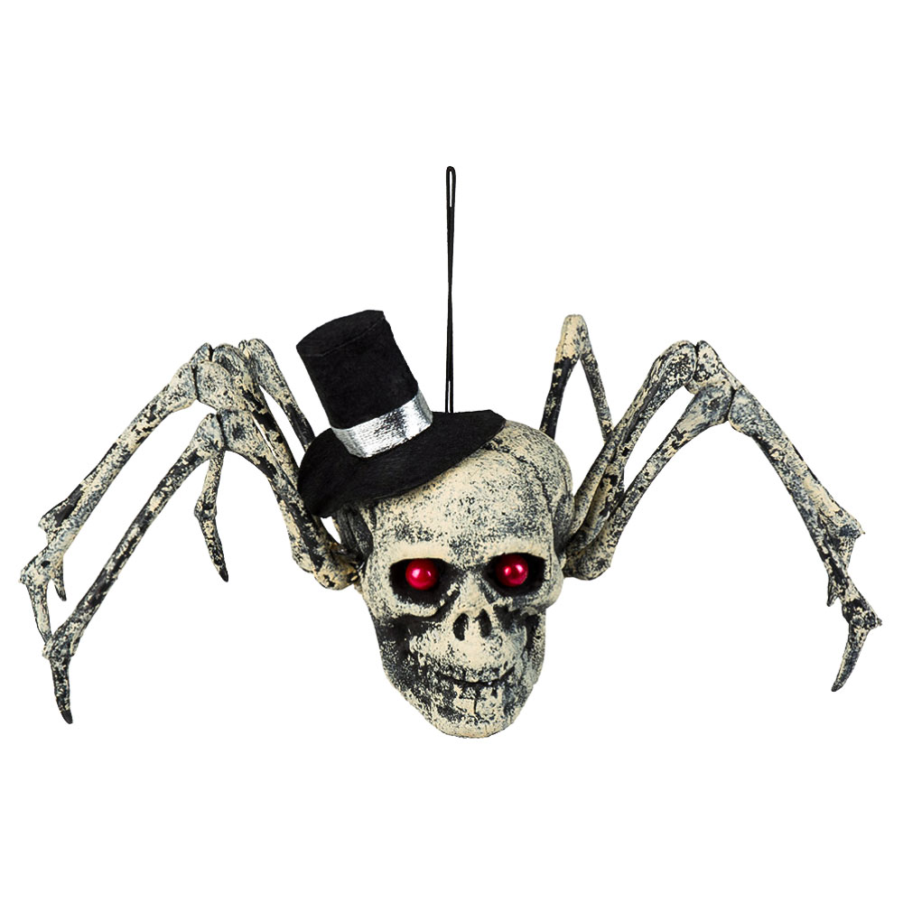 Läskig halloweendekoration i form av en döskalle-spindel med röda ögon och svart hatt. En kuslig spindel dekoration som passar helt perfekt för dig som vill skrämma dina spindel-rädda vänner. Den här spindeln kan du även dekorera med på flera olika sätt, du kan exempelvis hänga upp den i taket eller i fönstret med hjälp av den lilla upphängningsöglan.