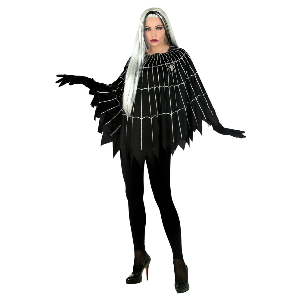 Spindelnät med Spindel Poncho omfattar en svart polyesterponcho med vitt spindelnätsmotiv. Ponchon kommer i one size och passar vuxna.