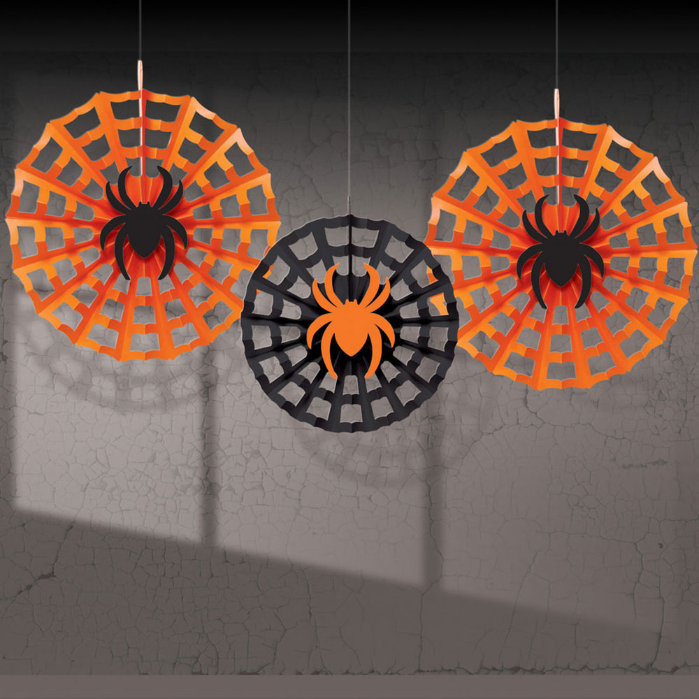 Spindelnäts Dekorationer med Spindlar innefattar ett paket med flera solfjäder dekorationer i pappmaterial som hängs upp med ett vitt snöre. De är i form av spindelnät med en stor spindel i mitten.