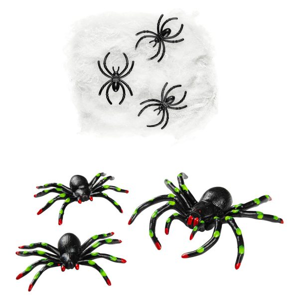 Spindelväv och Spindlar omfattar vitt spindelnät och svarta spindlar. Tillverkat av plast och polyester.