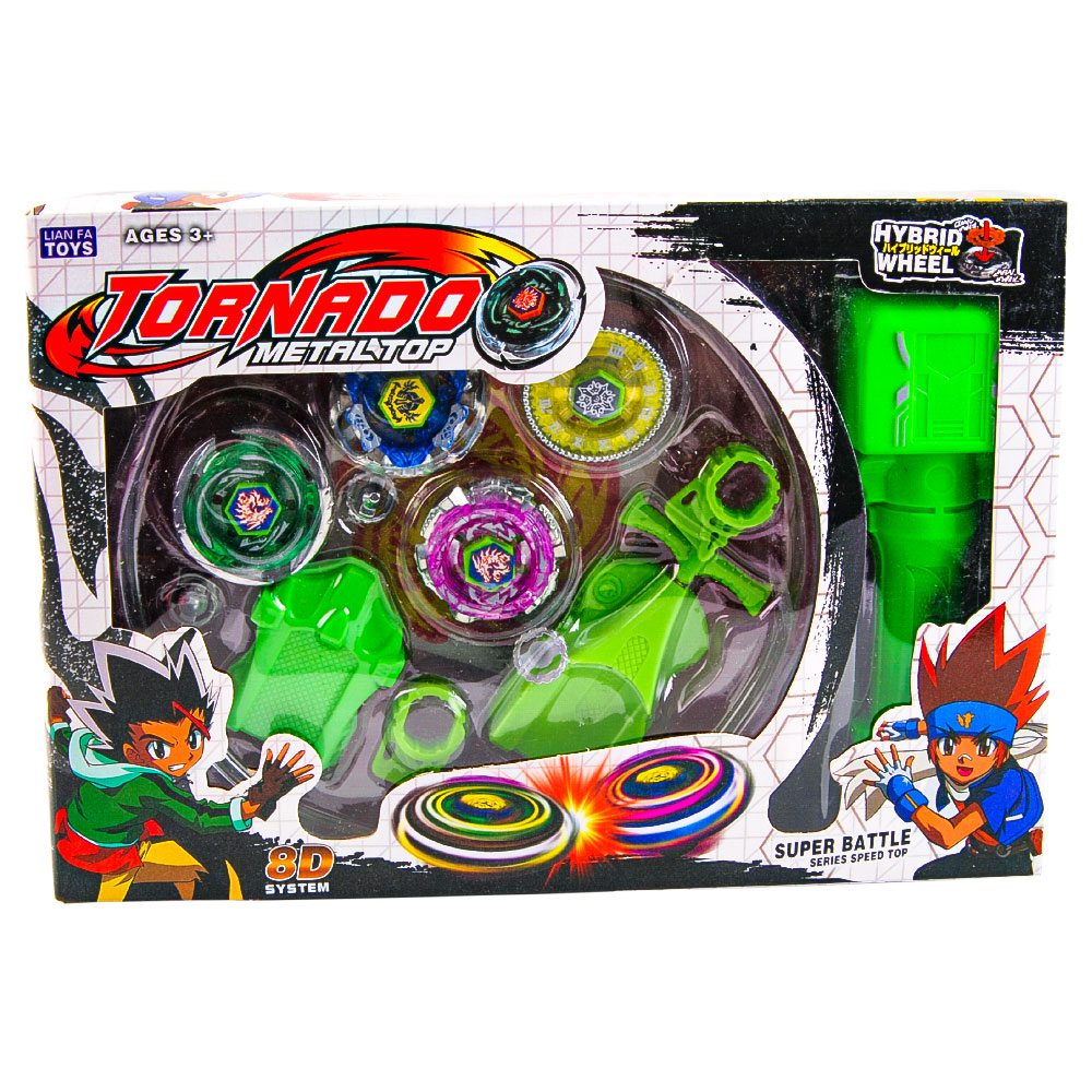 Spinning Top Tornado Set omfattar ett set som består av fyra spin tops, ett fat att snurra spin topsen i, tre stringlaunchers samt tillbehör.