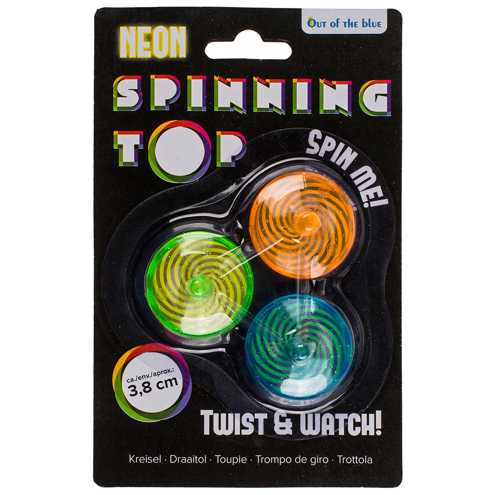 Spinning Tops Neon omfattar ett pack med 3 stycken spinning tops i olika transparenta neonfärger med glitter. Inuti snurran finns ett randigt mönster. Snurrorna är tillverkade i plast och är ca 3,8 cm i diameter.