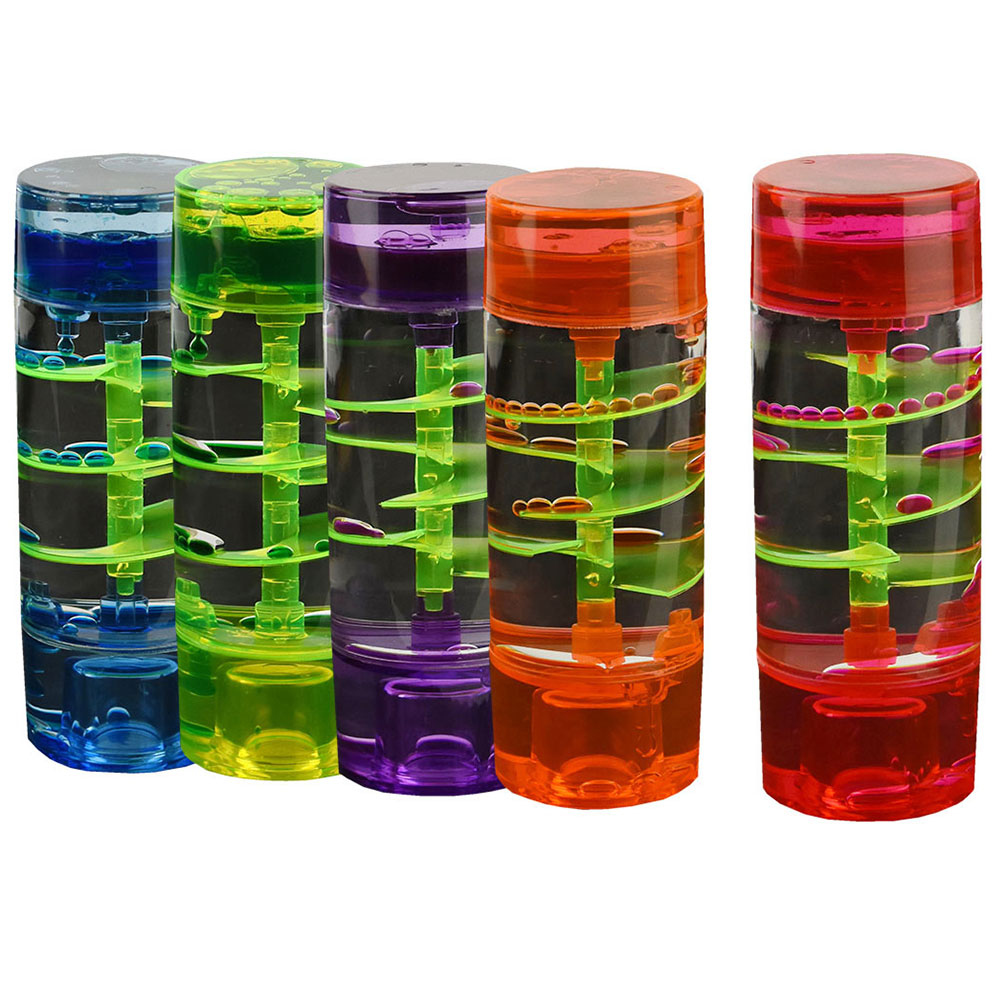 Spiral Timer med Vätska omfattar ett timglas utformat som en spiral där vätska långsamt åker ner i spiralen från toppen till botten när du vänder på den. Kommer i färgerna grön, orange, blå, rosa och lila, vilken du får blir en överraskning.
