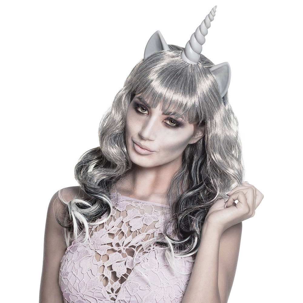 Enhörningar brukar vanligtvis vara glada, snälla och riktigt färgstarka varelser, men just den här enhörningen verkar vara något helt annat. Med denna kusliga enhörning peruk i grått kan du klä ut dig till en läskig unicorn som är allt annat än glad och snäll. Med andra ord en perfekt unicorn peruk för dig som vill skapa en ond, eller kanske till och med en död enhörnings utklädnad.