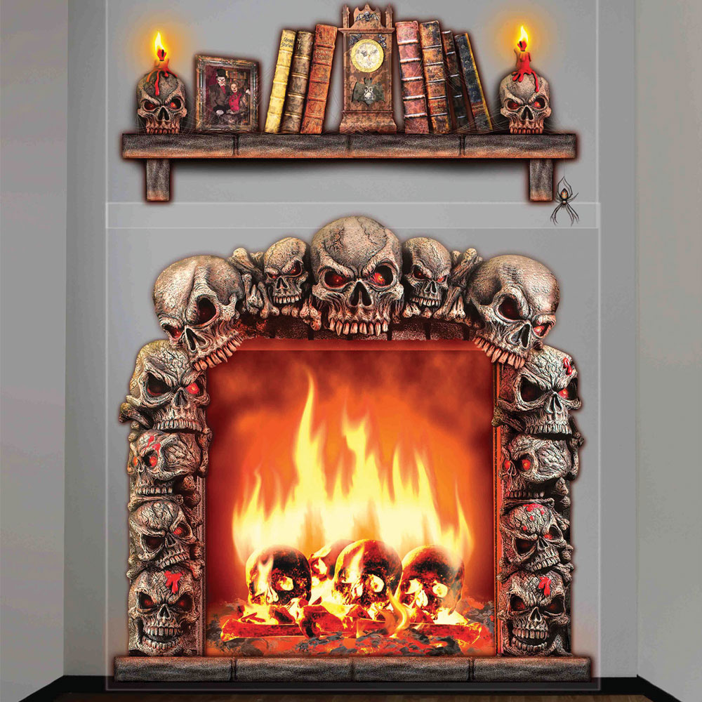 Spökhus Halloween Väggdekoration omfattar en enorm, detaljrik plastfilm som har tryck av en öppen spis omringad av dödskallar, samt en hylla med en klocka, böcker, ett par dödskallar med stearinljus, och ett fotografi.